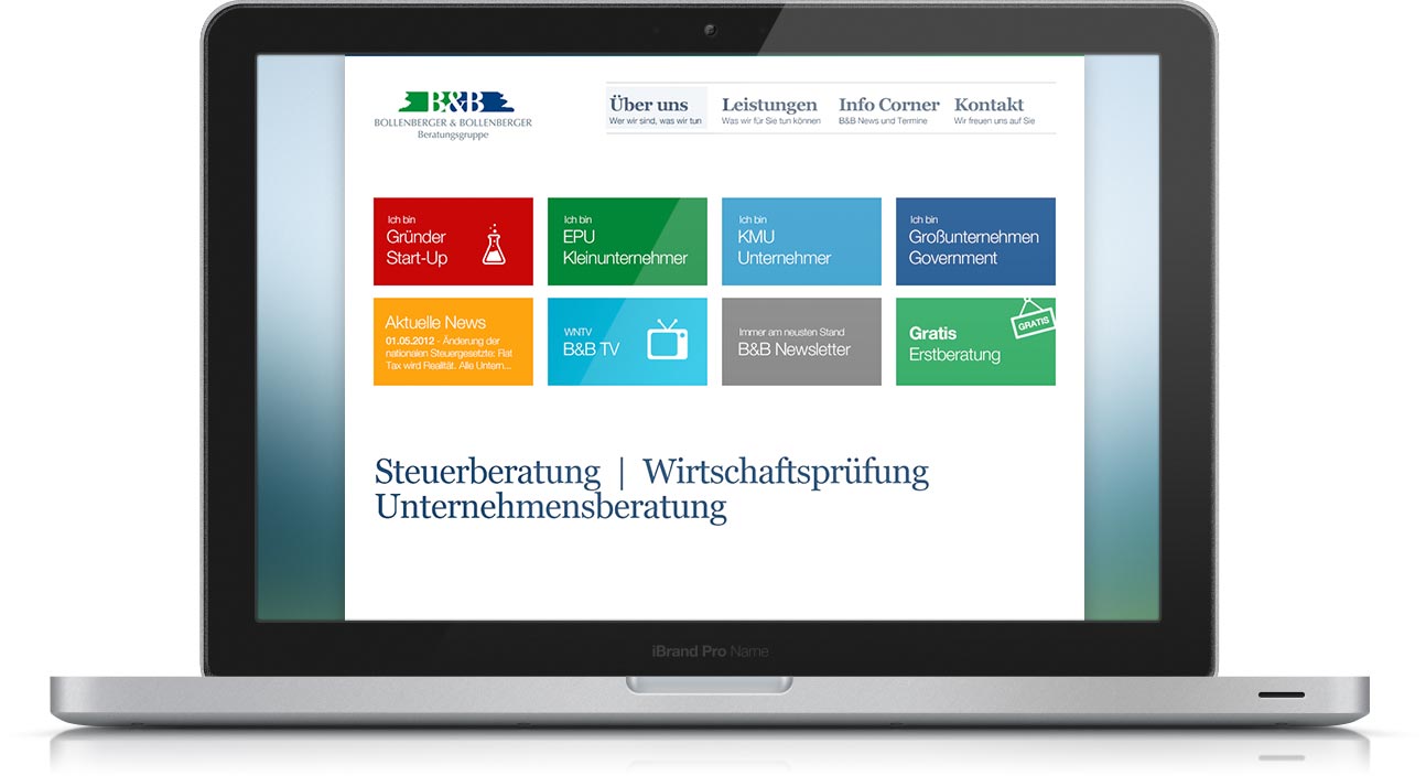To take a major step forward, you have to take a step back and start from scratch. That's exactly what we did for Bollenberger & Bollenberger when we rethought and redesigned their website. The first things we did were to analyse the different target groups, the needs of potential customers and the product portfolio that B&B offers. Key to the design process was making it simple for people to get to the facts of the very complex services that are offered. This, in an easy and constructive way.