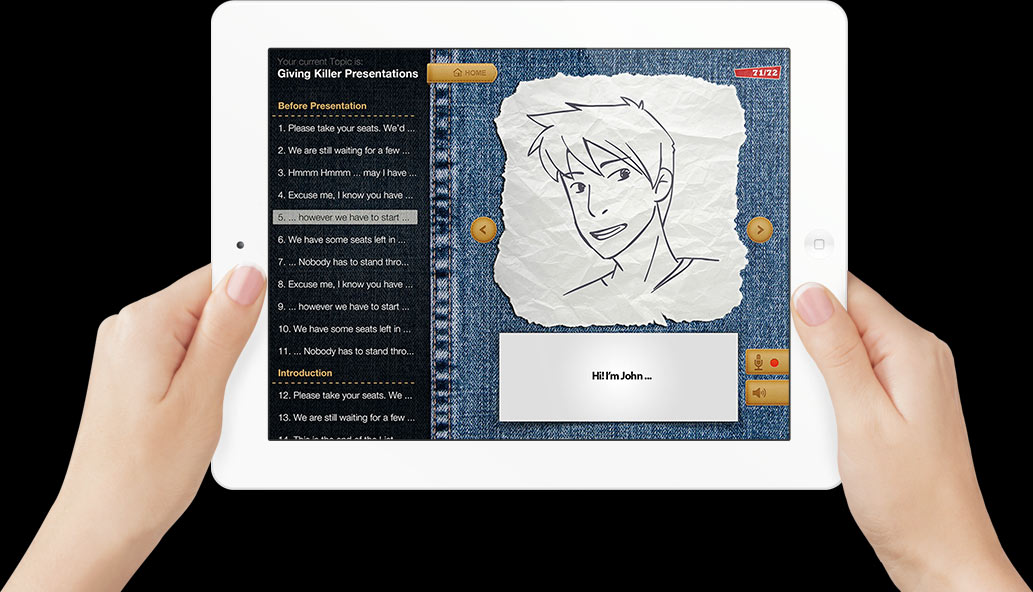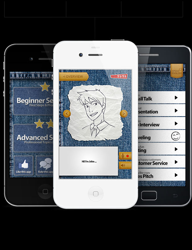 SpeakEnglish is an app for iPhone, iPad and Android Smartphones that helps you learn how to speak English. As typical users probably use the app at home, sat on the couch with the device on their laps, we created the jeans look. The users in the target group identify with this casual, relaxed look. Maybe they even wear jeans whilst using the app!